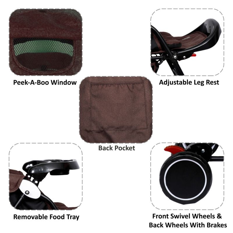 - Front Swivel Wheels And Back Wheels With Brakes:- Front Swivel Wheels Provide Maximum Comfort While Strolling In The City And Front And Back Wheels Brakes Provide Additional Safety