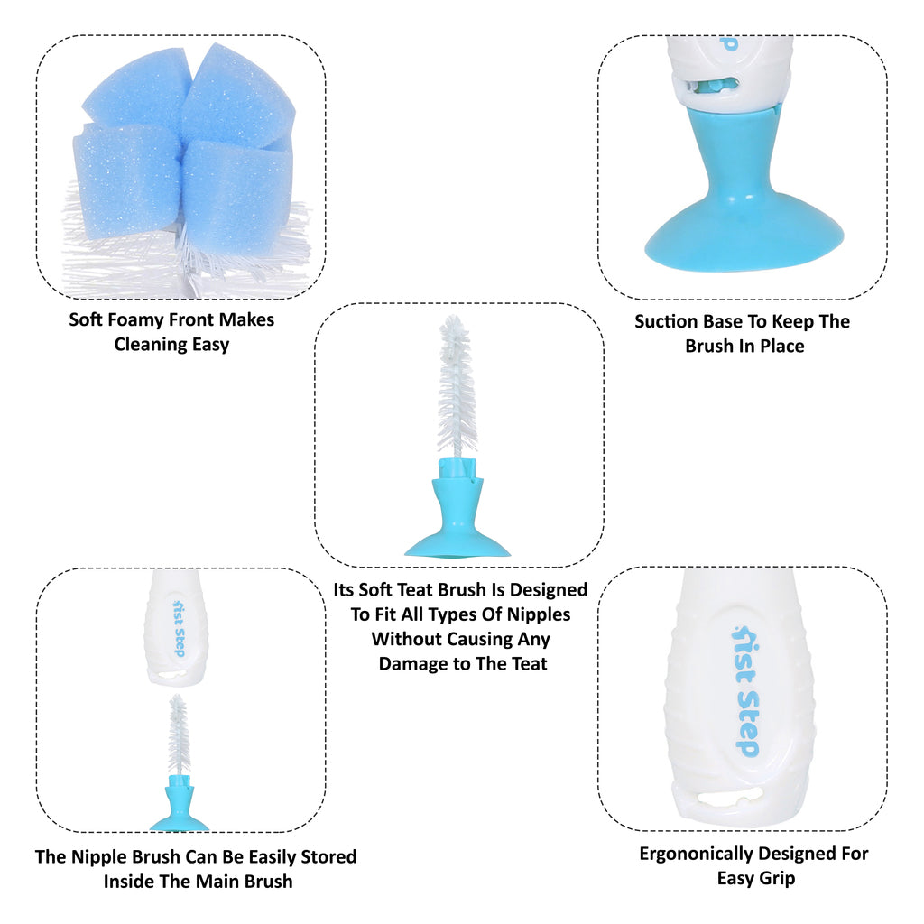 Description 1st Step Bottle Cleaning Brush Allows You To Clean All The Feeding Bottles And Its Accessories. The Bristles Eliminates All The Residues, Even The Areas That Are Difficult To Reach. The Brush Comes With Nipple Brush Which Helps In Cleaning The Nipple Of Feeding Bottle. Suction Base Helps To Keeps The Brush In Place While Cleaning.