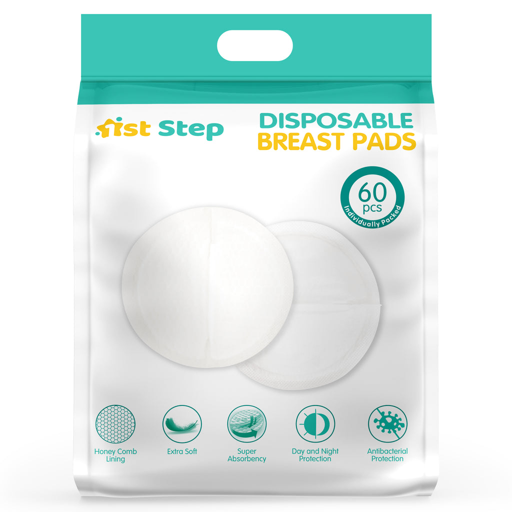 Description 1st Step Super Absorbency Disposable breast pads help you take on the world providing comfort and confidence.With just 3mm thickness,the pads fit like magic.The super soft texture coupled with non-slip adhesive tapes ensure that the pad is in place.While the honeycomb surface helps soak milk quickly,thus keeping your skin clean and fresh.Each breast pad is wrapped separately for better hygiene and flexible usage with all day protection.
