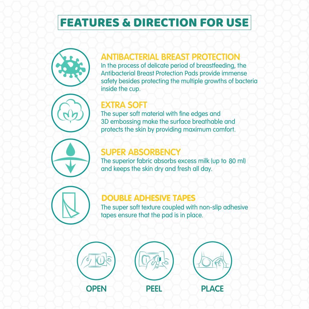 • ANTIBACTERIAL BREAST PROTECTION : In the process of delicate period of breastfeeding, the Antibacterial Breast Protection Pads provide immense safety besides protecting the multiple growths of bacteria inside the cup