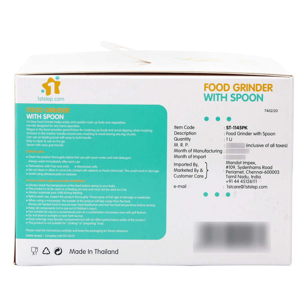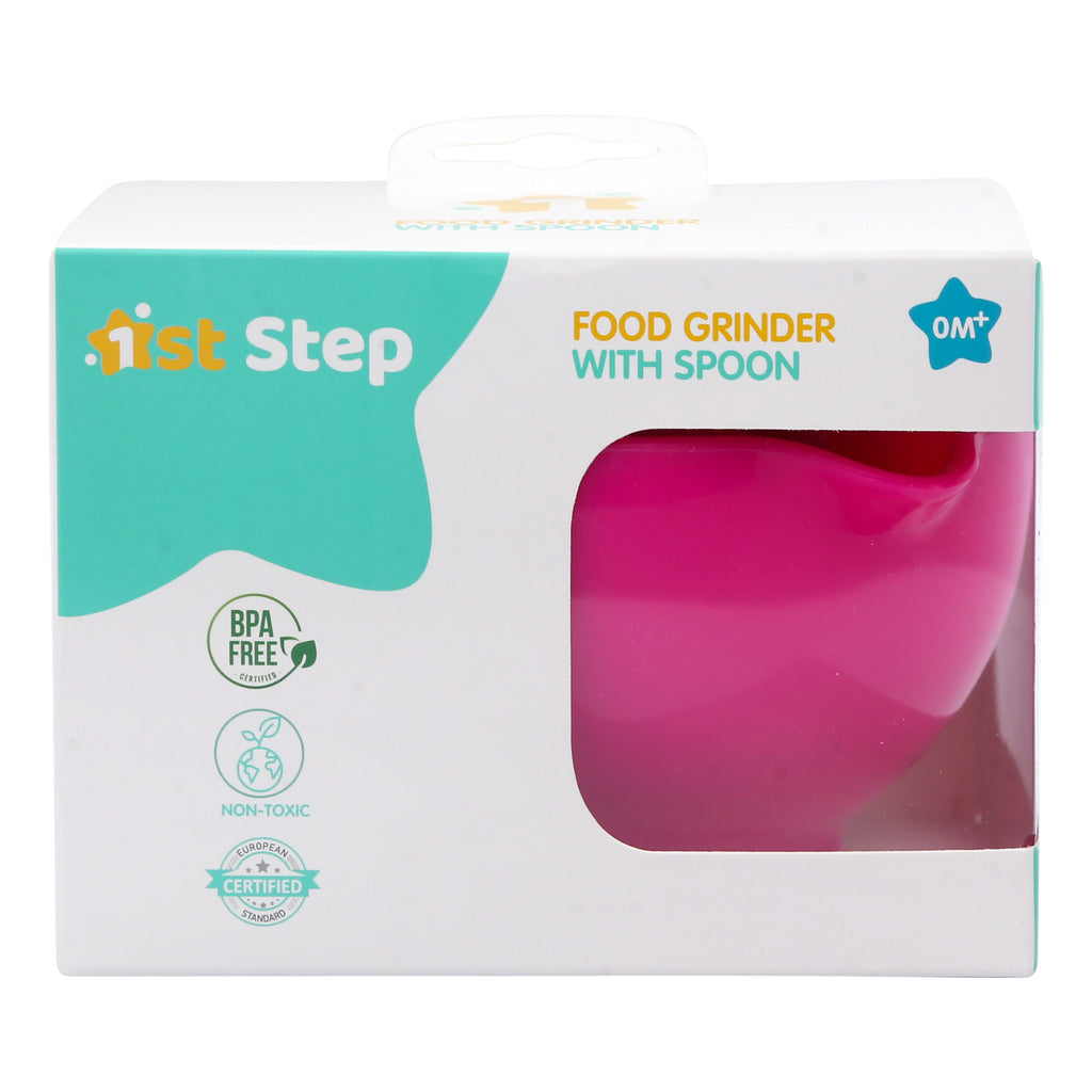 1st Step Food grinder helps to easily and quickly mash up fruits and vegetables. Ridges in the bowl provides good friction for mashing up food and avoid slipping when mashing. Grooves in the masher handle ensure even mashing & avoid leaving any big chunks. Can use as feeding bowl with easy to hold handle. Easy to clean & use on the go. Contains Spoon with easy grip handle. |