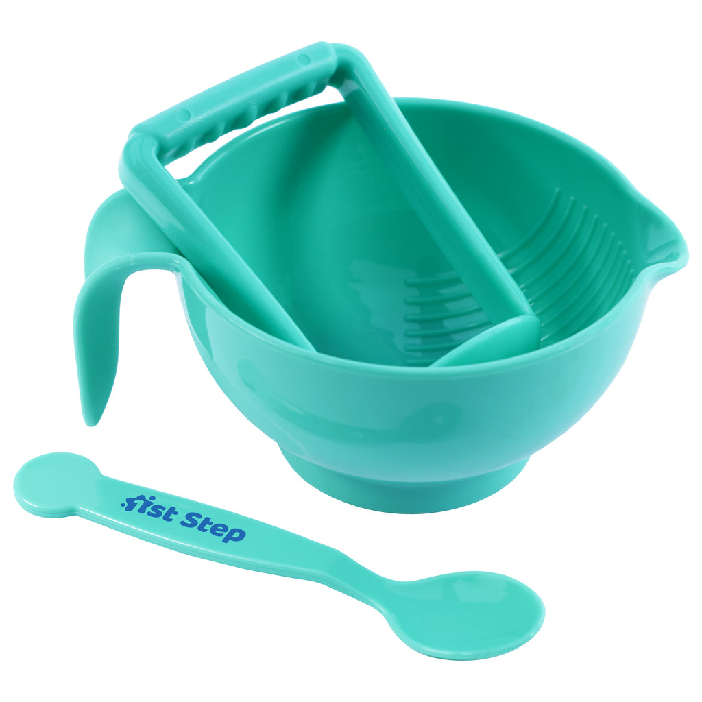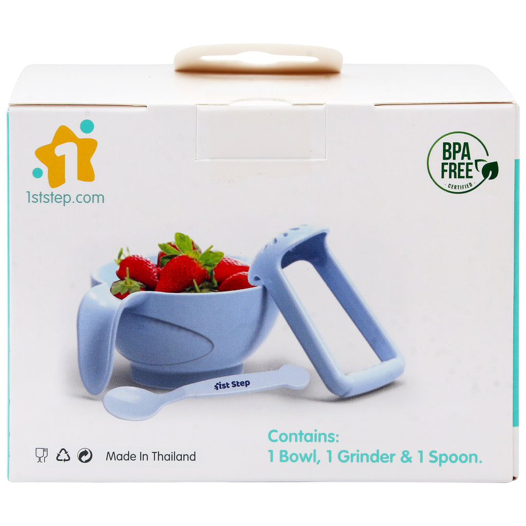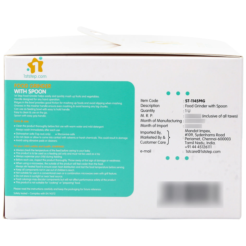 1st Step Food grinder helps to easily and quickly mash up fruits and vegetables. Ridges in the bowl provides good friction for mashing up food and avoid slipping when mashing. Grooves in the masher handle ensure even mashing & avoid leaving any big chunks. Can use as feeding bowl with easy to hold handle. Easy to clean & use on the go. Contains Spoon with easy grip handle. |